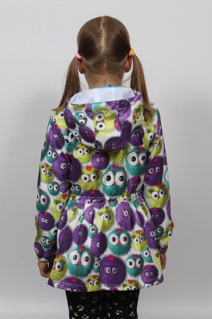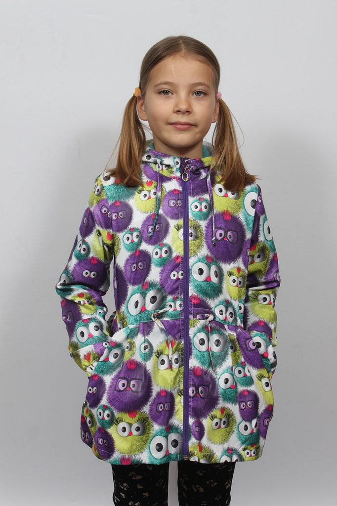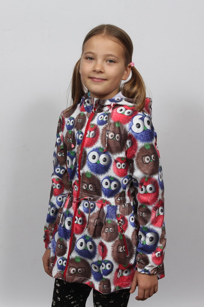6 размеров:22/98;24/104; 26/110;28/116;30/122;32/128. 2 цвета:фиолетовый,красный. Верх – принт (полиэстер 100%) Подкладка (хлопок 100%, рукава - сетка) Рукава куртки с манжетом на резинке По талии - кулиса Капюшон - вточной По молнии ветрозащитная планка